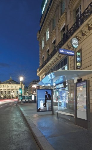 在城市中推出更智能与更环保的巴士候车亭,从巴黎开始,全新的巴士候车亭配备了光伏面板,绿色顶部,USB充电口和提供实时当地信息的电子信息屏。