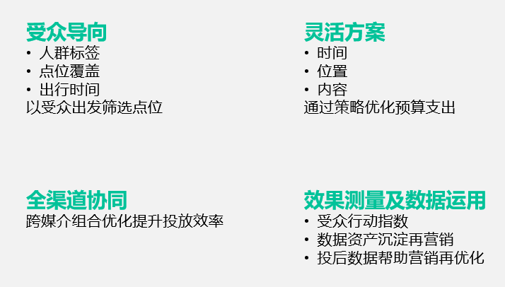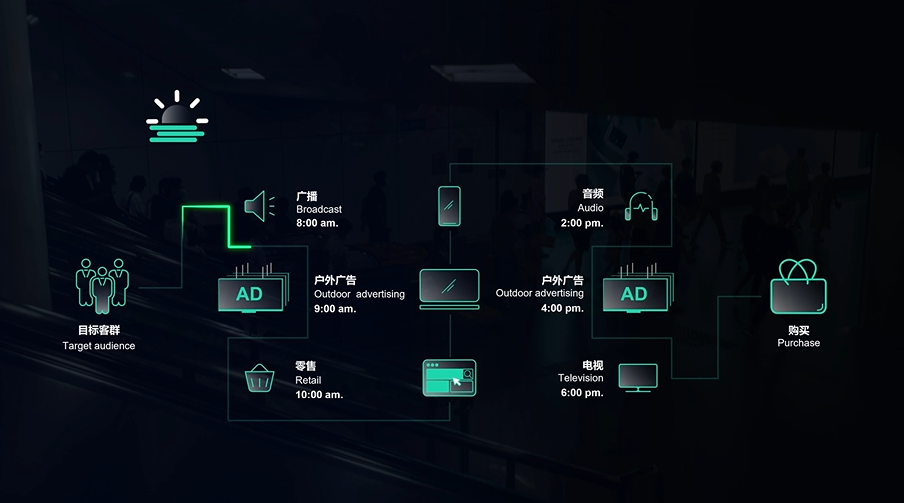 在信息和注意力极度碎片化的时代,为扩大消费者触点,影响消费者购买行为,线上线下结合的全渠道营销已经是广告主共识。基于统一的度量逻辑,通过程序化购买,品牌方可以与线上广告一样,在一个目标消费者一天中所涉及的消费路径上,分时段、分地点精准发布品牌广告,全渠道多点触达,促成消费者的转化。
